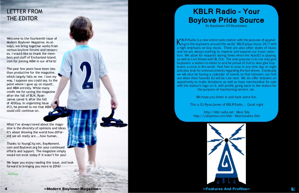 El logo triangular de Boylover aparece a lo largo de toda la revista, incluyendo el logo de KBLR (BoyLover Radio):