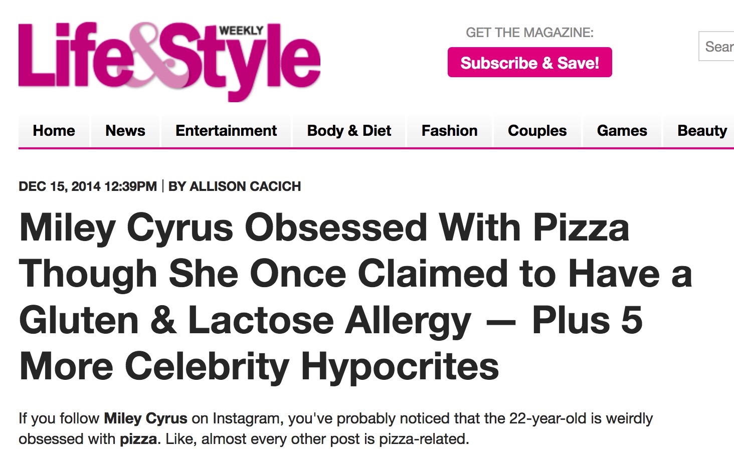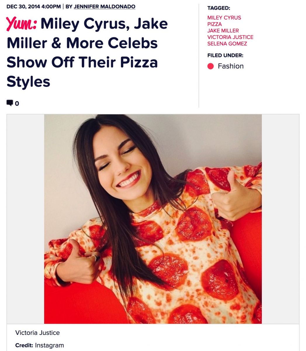 El 15 de Diciembre del 2014, Life & Style escribió “Si sigues a Miley Cyrus en Instagram, probablemente que esta joven de 22 años está extrañamente obsesionada con la pizza”