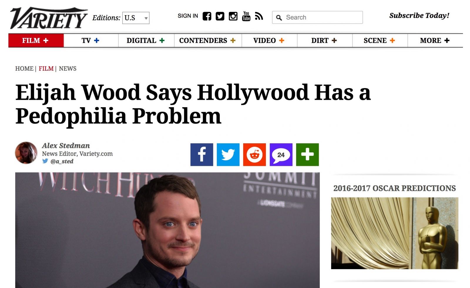 El 23 de Mayo del 2016, el actor principal del Señor de los Anillos, Elijah Wood, dijo que el problema más grande en Hollywood siempre ha sido la pedofilia.