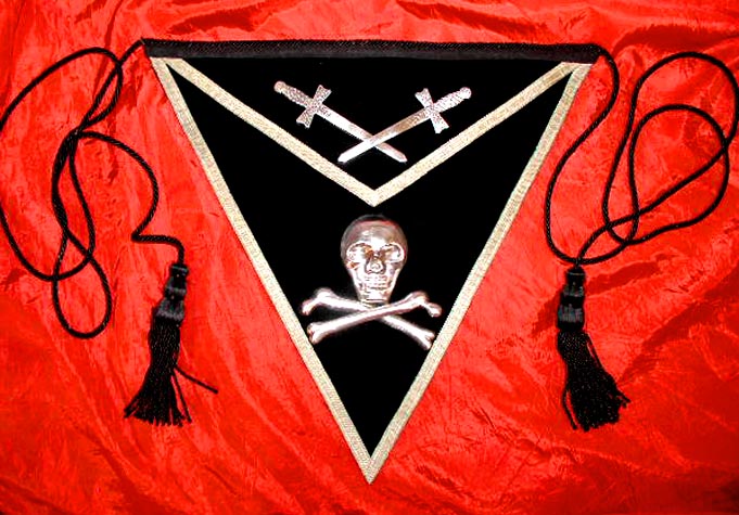La banda masónica para el grado 32° de hoy en día cuenta con una corona sobre ella — simbolizando claramente la consecución de este ilustre objetivo. El “32” en el triángulo está rodeado de dagas de sacrificio — situados directamente encima del cráneo y los huezos cruzados sobre el delantal.