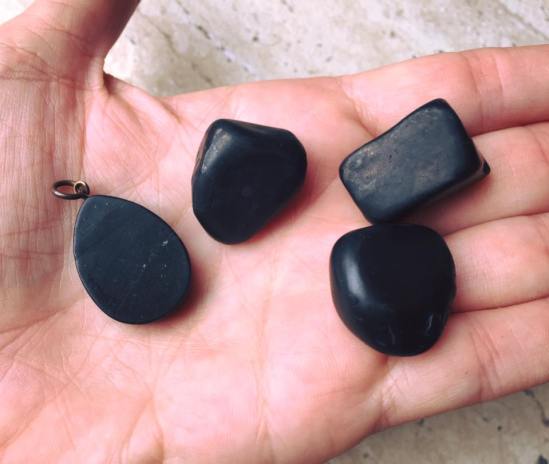 Tipo II – shungita negra. Más fácilmente disponible, más barata, 50-70% de carbono y más fácilmente pulida, por lo que se encuentra comúnmente en los colgantes y otras joyas, dispositivos de bloque de EMF, pirámides y esferas, etc.