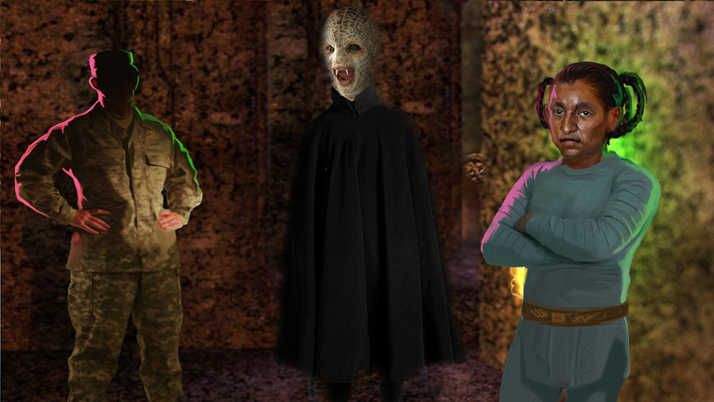 La siguiente ilustración muestra lo que hemos llamado la raza Blue Avian, así como la raza del Triángulo Dorado. Uno de cada uno apareció detrás de Corey.