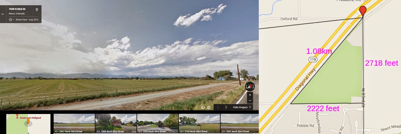 El helipuerto de Anderson en Niwot es muy interesante. En el medio de la nada, la vista de Google Street muestra que es solo terreno de cultivo, sin embargo, aparece como helipuerto. Tiene la forma de un triángulo pitagórico (ver el artículo de Nueva York), una esquina de la cruz templaria va exactamente a la punta del triángulo, y esa línea sigue exactamente el lado derecho del triángulo. Sus dimensiones son bastante claras: