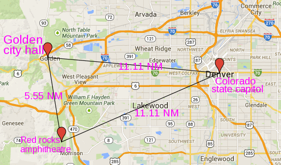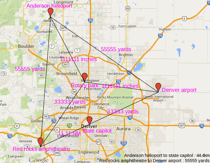 Esa estatua se encuentra a 2.22 millas náuticas (MN es la unidad utilizada por los barcos y aviones) del edificio del capitolio de Colorado. 16180 pies del pabellón del parque de la ciudad, evocando Phi, el número de oro. 5.055 MN de la logia masónica Aurora. 44444 pies del edificio municipal de Aurora. 3,33 MN del centro pepsi. 33333 yardas desde el aeropuerto de Denver. 4.44 MN del coliseo de denver.
