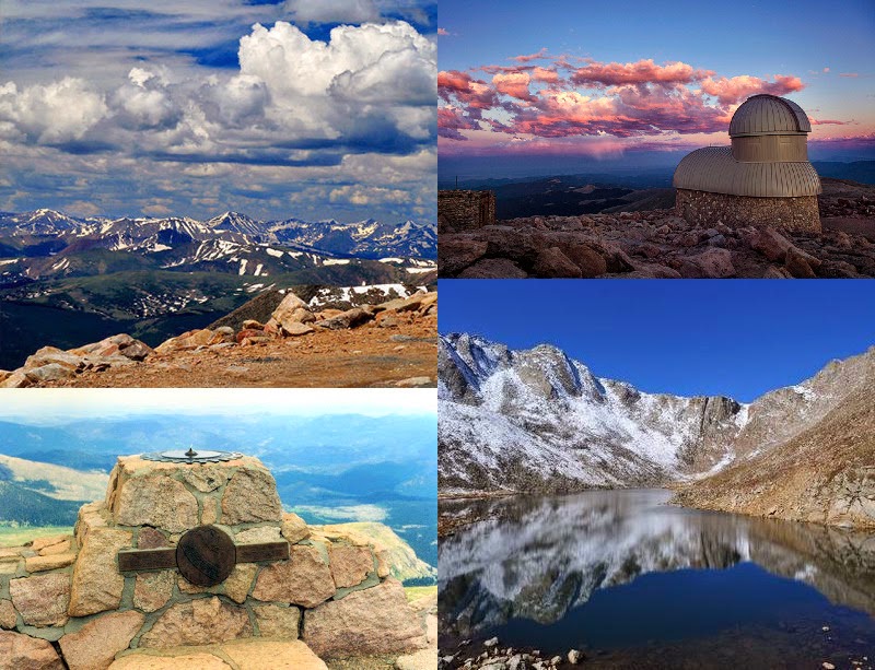 La cima del monte Evans tiene una gran vista, un observatorio, una marca-rotonda del club y un lago:
