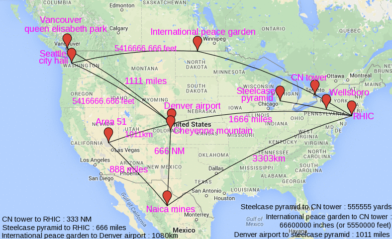 Además, las minas de naica están situadas a 111111111 pulgadas del edificio masónico central de Vancouver. La línea entre los dos va exactamente a través de la página en Arizona.