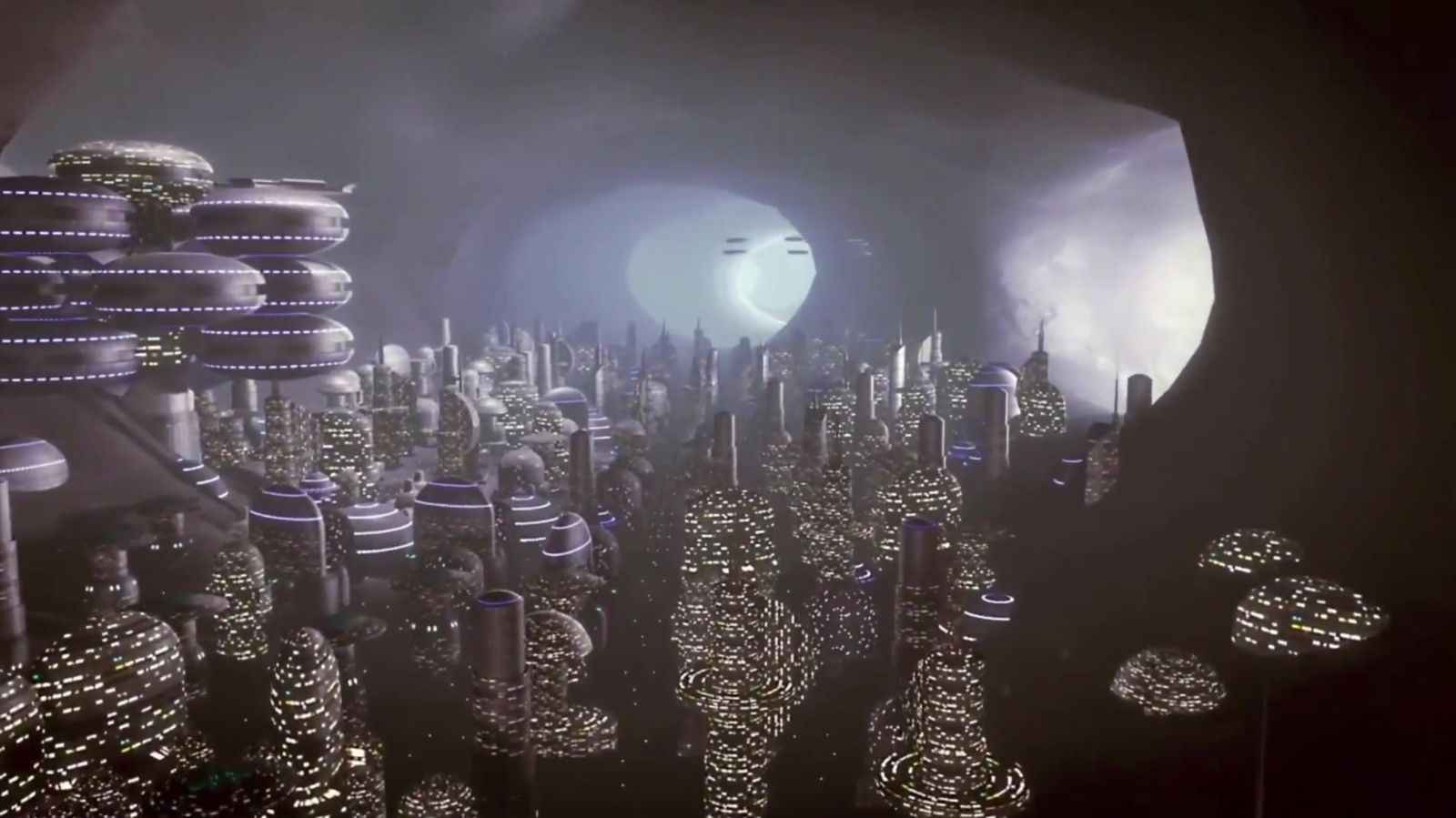 Corey: Puedes ver todas las ciudades distribuidas a lo largo de la esfera. La parte superior de los edificios está orientada hacia el punto central de la esfera.