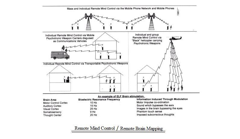 Solo revisa los detalles en estas diapositivas también. El helicóptero negro disparando sus armas psicotrónicas, mapeando tu cerebro, transmitiendo tus pensamientos a algún centro de fusión. Me gustaría que su ejemplo de “ELF Brain stimulation” fuera un poco más claro.