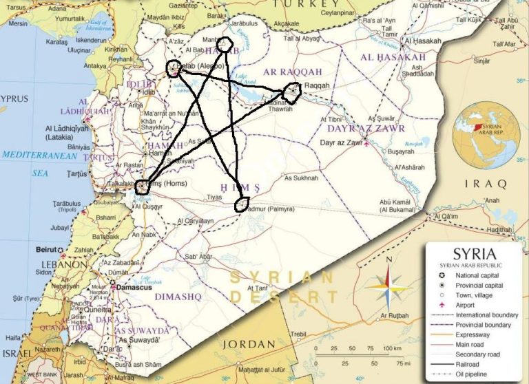 Cuando extiendes las cinco líneas hacia afuera, verás una nueva imagen sobre la conciencia de la masa. Una vez que lo observen más de cerca, las líneas ley (dibujadas hacia afuera) del pentagrama de Siria pueden conectar tres ciudades religiosas principales: Jerusalén, La Meca y Medina. Además, tienes a (la) Gran Pirámide a un lado como una ‘Estación Base’ planetaria. Quien controla Siria, el pentagrama controla el cristianismo, el judaísmo y el islamismo. En términos generales, puede decidir el destino de la mitad de la población de superficie.