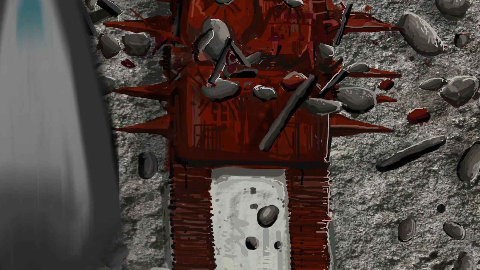 Vi algunos cuerpos, cuerpos antiguos, y vi un montón de cosas en el suelo como estas vigas I que estaban rotas y quebradas que parecían extremadamente fuertes, pero estaban hechas de ese mismo material metálico de tipo cristalino.