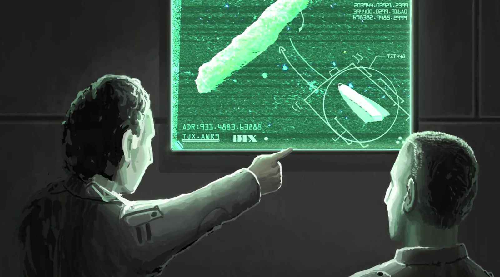 Se paró al lado de la pantalla, y luego giró hacia nosotros en la mesa, y dijo: “Durante algún tiempo, hemos estado observando lo que parece ser una nave abandonada que ha venido hacia nuestro Sistema Solar, y es, ya sabes, una de las muchas cosas que estamos monitoreando”.