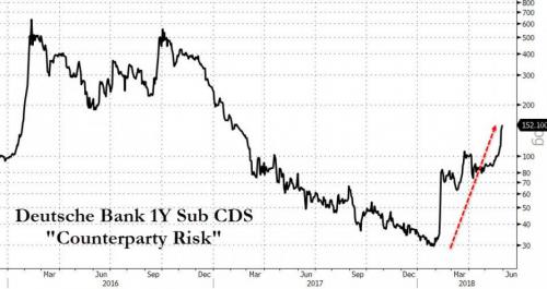 … el mercado no está de acuerdo, y además de liquidar acciones de DB, ha enviado al CDS subordinado 1Y del banco alemán, es decir, su “riesgo de contraparte” en alza, si bien sigue estando muy por debajo de sus máximos de 2016.