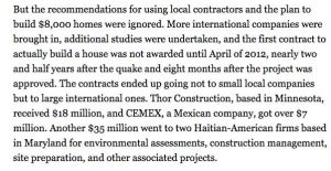 El informe, adoptado por la ONU y los EE.UU., dejó una huella en muchos de los documentos de planificación posteriores al terremoto. Entre los principales campeones del plan estuvieron los Clinton, que jugaron un papel crucial en atraer a un jugador global a Haití. Mientras se encontraba en un viaje oficial a Corea del Sur como Secretaria de Estado, Hillary Clinton llevó funcionarios de la compañía de uno de los mayores fabricantes de Corea del Sur a la embajada de Estados Unidos para venderles la idea. El secretario general de la ONU, Ban Ki-moon, que acaba de nombrar a Bill Clinton enviado especial de la ONU para Haití, aprovechó las conexiones en su país de origen, Corea del Sur… [3]