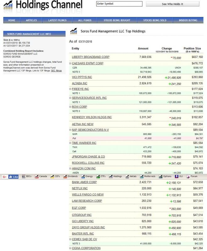 SOROS FUND MANAGEMENT LLC – TOP HOLDINGS al 31/03/18 …