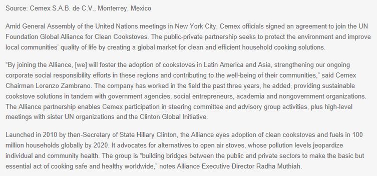 En la Asamblea General de las reuniones de las Naciones Unidas en la ciudad de Nueva York, los funcionarios de Cemex firmaron un acuerdo para unirse a la Alianza Global de la Fundación de las Naciones Unidas para Estufas Limpias. La asociación público-privada busca proteger el medioambiente y mejorar la calidad de vida de las comunidades locales creando un mercado global para soluciones de cocina domésticas limpias y eficientes.