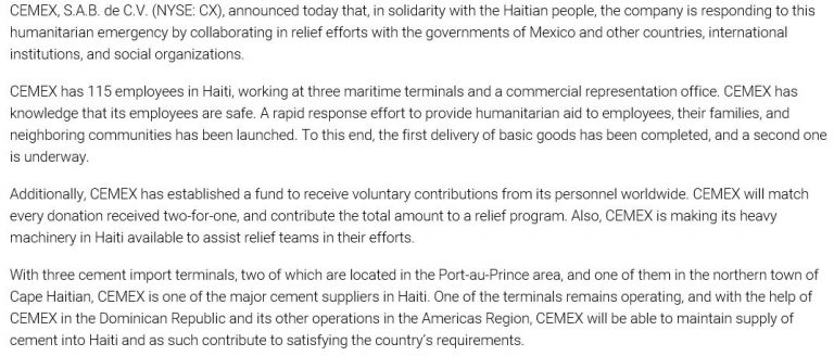 CEMEX contribuye al esfuerzo de ayuda a Haití
