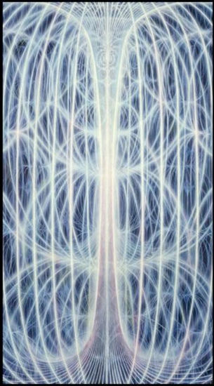 El artista visionario Alex Gray captura la esencia de esto en su pintura de la serie Sacred Mirrors, Universal Mind Lattice.