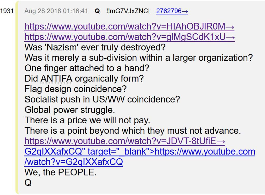 En su publicación del 28 de agosto, QAnon ha señalado sucintamente cómo el nazismo continúa floreciendo hoy debido a una misteriosa mano oculta, el Estado / Fraternidad profunda, que dio lugar al surgimiento inicial del nazismo en Alemania y su posterior encarnación en la postguerra mundial. II era una red de corporaciones transnacionales y sociedades secretas que formaban colectivamente un Cuarto Reich.