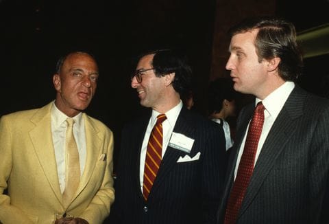 Trump contrató a Roy Cohn, que trabajó como abogado para los jefes de la mafia John Gotti, Tony Salerno y Carmine Galante. Trump también ha sido amigo del asociado de la mafia Robert Libutti. S&A Concrete de la familia Gambino-Genovese participó en la construcción del edificio de Trump en Manhattan con el jefe genovés Tony Salerno como propietario. A continuación está Trump con el abogado de la mafia Roy Cohn.