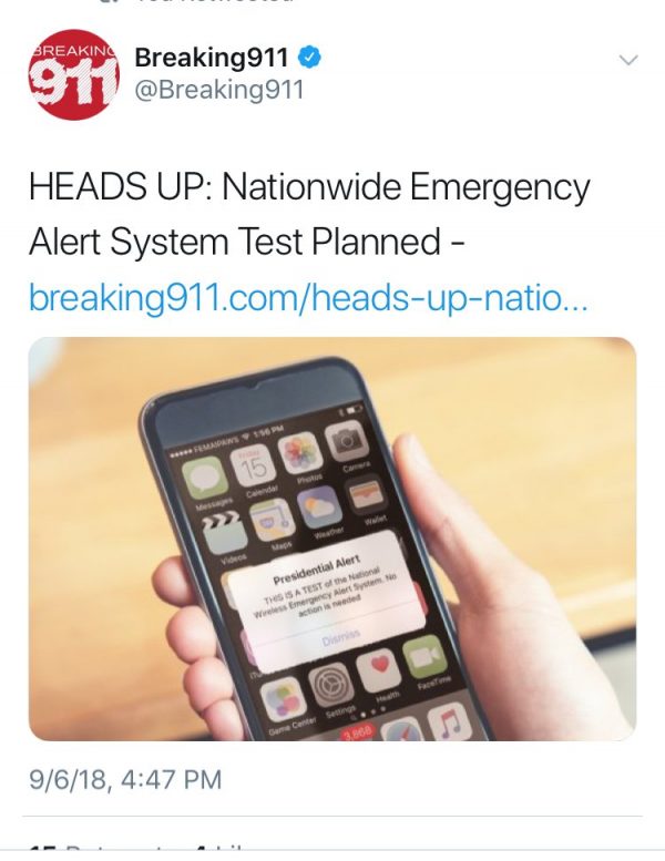 El 6 de septiembre de 2018, Q Anon publicó información de que el sistema de transmisión de emergencia se probaría a partir del 20 de septiembre de 2018:
