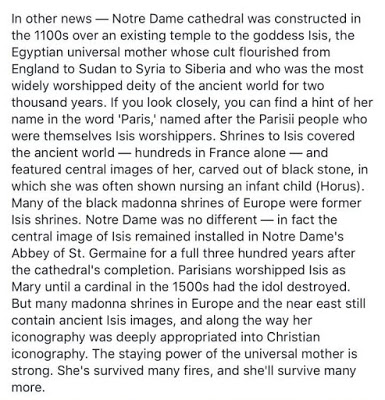 Muchas de esas catedrales tenían estatuas de Madonnas negras, que en realidad son versiones cristianas de estatuas de Isis de piel oscura, que a veces cuidan a su hijo, Horus.