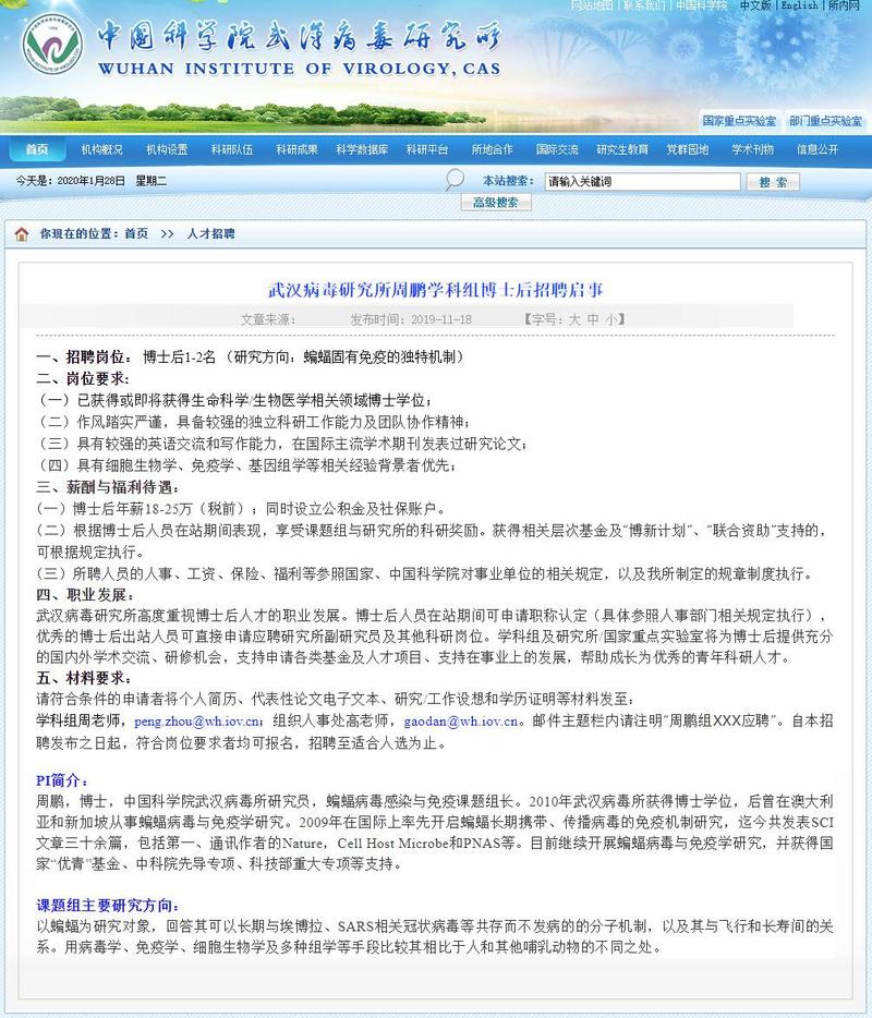 ¿Por qué es esto notable? Porque resulta que este es un puesto de trabajo para el laboratorio del Dr. Peng Zhou (周鹏), Ph.D., investigador del Instituto de Virología Wuhan y Líder del Grupo de Infección e Inmunización de Virus en Murciélagos. Un poco más sobre los antecedentes de Zhou del Instituto ( traducido por Google):