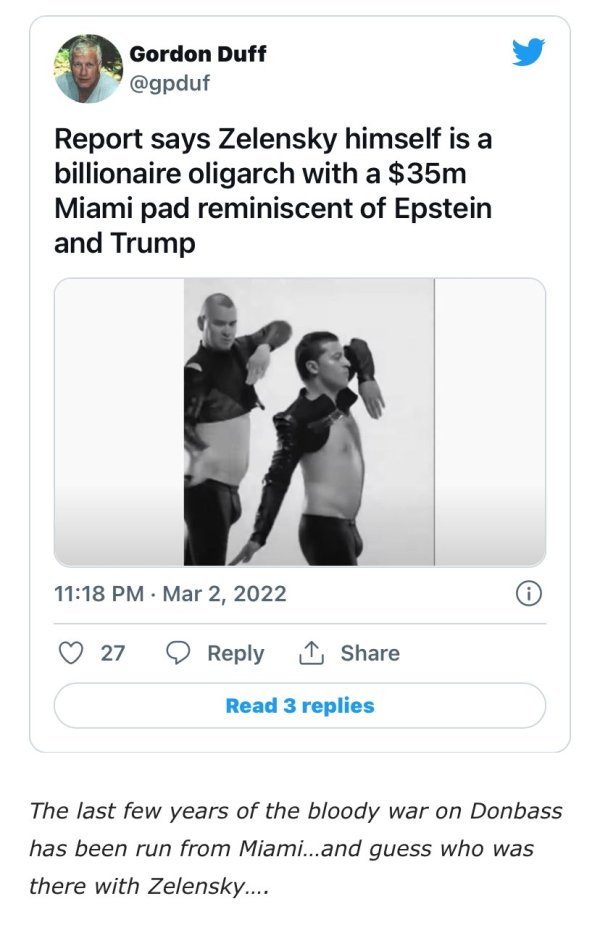 Tanto el FSB como la CIA dicen que el presidente títere ucraniano de la mafia jázara , Volodymyr Zelensky, huyó a Polonia hace mucho tiempo. También le prometieron una rica jubilación en Florida. Vea fotos adjuntas de sus activos en Costa Rica en Dresner Bank ($1.3 mil millones) y su casa de $34 millones en Miami, Florida.
