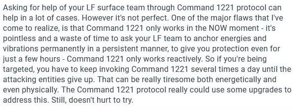 Ahora es un buen momento para comenzar a conectarse nuevamente con las fuerzas de la Luz. Puede usar el Comando 1221 para conectar con su equipo de Luz y aquí hay algunos comentarios útiles de los comentarios de los lectores de este blog: