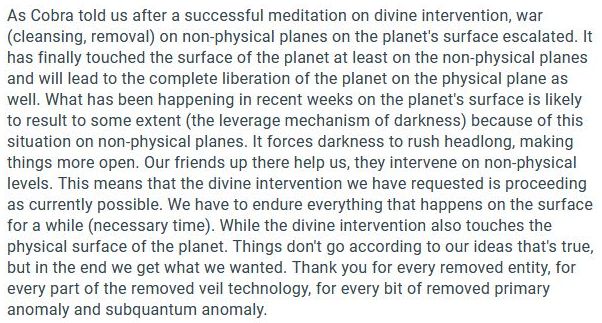 Nuestra Activación de la Intervención Divina en diciembre de 2021 ha desencadenado cambios tectónicos en el proceso de liberación planetaria, como quedó ampliamente explicado en este comentario, publicado en mi blog hace algún tiempo: