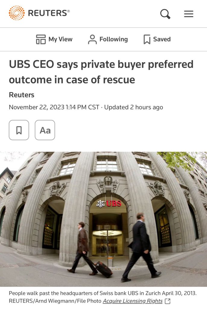 Primero el miércoles, durante una conferencia de riesgos en Suiza, el director general de UBS comentó casualmente que “En caso de un rescate, UBS preferiría a un comprador privado”…