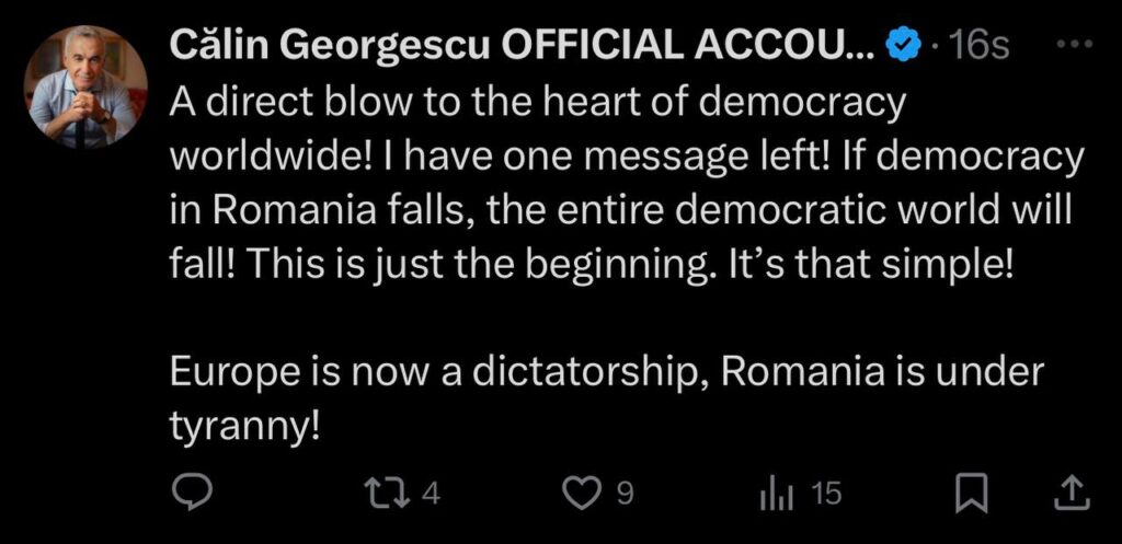 Los fascistas de la UE también intentan impedir que el patriota Călin Georgescu se convierta en presidente de Rumanía porque aún creen que será una base para atacar a Rusia. «Europa es ahora una dictadura», comenta Georgescu. Aunque no por mucho tiempo.
