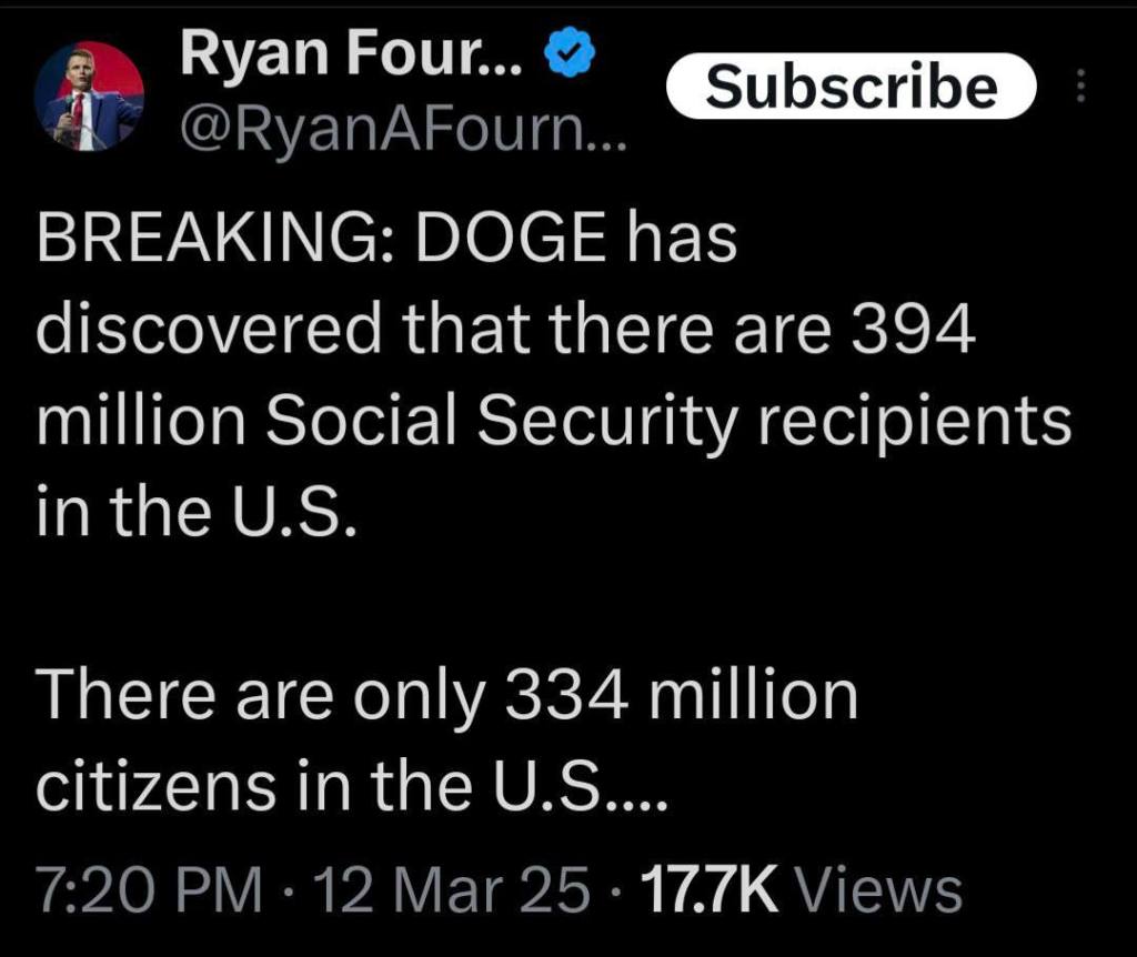 En un movimiento más grande, DOGE descubrió que hay 394 millones de beneficiarios de la Seguridad Social en los EE.UU., a pesar de que solo hay 334 millones de ciudadanos en el país.