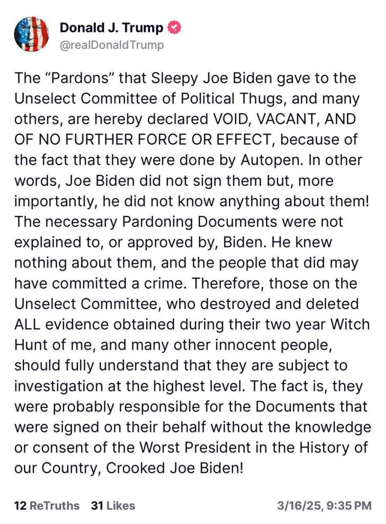 Ahora Trump dice que los indultos de Biden son NULOS/NO VÁLIDOS porque fueron firmados automáticamente.